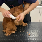 Что делаем мы: Наносим специальный питательный крем, который смягчает огрубевшую кожу, заполняет микроповреждения и возвращает эластичность. Это как увлажняющий крем для рук — только для лап вашего питомца. После курса кожа становится более устойчивой к влаге и перепадам температур.
